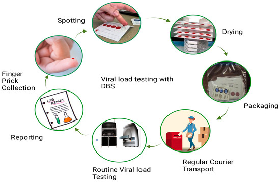 The principle of DBS-based HIV-1 viral load testing revolves around the collection, drying, and subsequent analysis of a small volume of blood from an individual living with HIV (Figure 3). This method eliminates the need for immediate sample processing and enables easy transportation and storage.