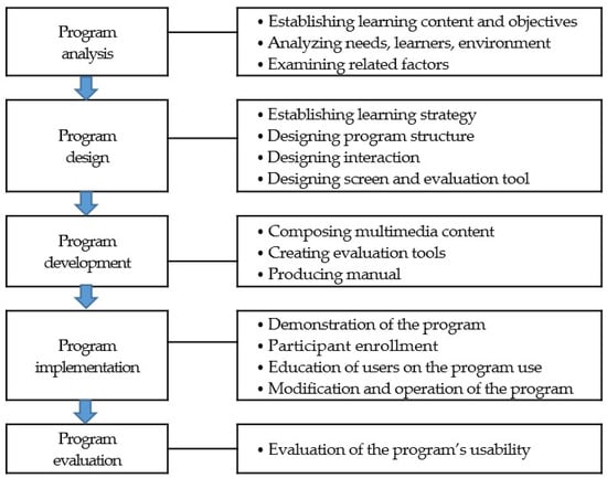 This study employed a randomized controlled pretest–posttest experimental design to investigate the effects of a mobile-integrated COVID-19 nursing practice simulation program. The program was developed based on the Analysis, Design, Development, Implementation, and Evaluation (ADDIE) model and prior COVID-19 experiences on knowledge, infection prevention practice confidence, and clinical decision-making anxiety and confidence (Figure 1).
