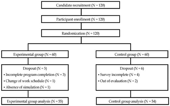 Participants were convenience-sampled from nurses with at least 6 months of clinical experience, without experience in a COVID-19 unit, from a 500-bed secondary hospital in Gyeonggi Province, South Korea. This study was approved by the Institutional Review Board at G University (1044396-202201-HR-013-01) (6 April 2022). The sample size was determined using the G*Power 3.1.9.6 software. For an independent t-test (one-tailed), using a medium effect size of 0.5, significance level of 0.05, and power of 0.80, the minimum sample size was calculated as 53 for each group, for a total of 106 participants. The effect size was determined based on a similar previous study by Lee and Choi and sample design reference [10,11]. Taking potential dropouts into account, a total of 120 participants were targeted, with 60 participants in each group. Of the participants, 5 from the experimental group and 6 from the control group withdrew from the study, leaving a total of 109 participants to be included in the analysis (Figure 2).