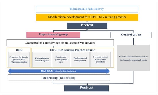 We began developing the mobile education program and preparing the simulation environment on 1 January 2021. The simulation was created using the developed program from July to September. To minimize bias in the selection of the experimental and control groups, the groups were assigned using the RANDBETWEEN feature of Excel 2019, and the two groups were separated by shift schedule. The experimental group completed the mobile program before participating in the simulation. Nurses with prior experience in COVID-19 units and nurses who did not complete the mobile program were excluded.