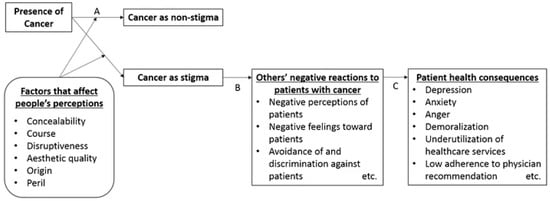 Fujisawa and Hagiwara’s conceptual model of cancer stigma [15]. A: The presence of cancer in itself is not always considered as a stigma, particularly when it does not convey a deviation from the norm and/or is not associated with undesirable qualities. B: The presence of cancer, once labeled as a stigma, can induce negative reactions among the general population toward the patients. C: Negative reactions from others can impact patient health status as well as health-related behaviors.