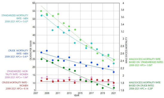 Mortality rates due to COPD by gender in the years 2008–2021 (left ordinate axis) and male excess mortality from COPD in the years 2008–2021 (right ordinate axis). * significant values were marked at p < 0.05.