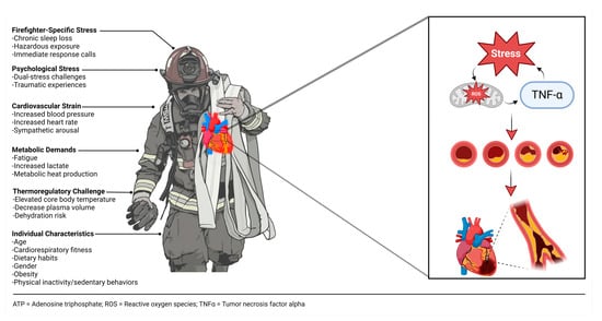 Indeed, factors associated with cardiovascular disease risk and suffering from an on-duty SCE are multifaceted (Figure 1). Acute and chronic exposure to oxidative stress and inflammation may play a key mechanistic role in cardiovascular disease risk [23,24]. Oxidative stress, the imbalance of reactive oxygen species and antioxidants, has been implicated in the development of cardiovascular disease. Firefighting increases the metabolic stress placed on the firefighter, which leads to an increase in free radical production. Additionally, inflammation may play a critical role in vascular dysfunction [25]. Pro-inflammatory cytokines, such as tumor necrosis factor-α and interleukin-6, are elevated following engagement in fire suppression activities [23,26,27,28,29]. Moreover, Huang et al. noted that these pro-inflammatory cytokines are elevated in response to mental and physical stress conditions [30]. Although acute exposure to oxidative stress and inflammation may be advantageous for adaptation, chronic exposure leads to insulin resistance, impaired glucose tolerance, and cardiovascular dysfunction [30].