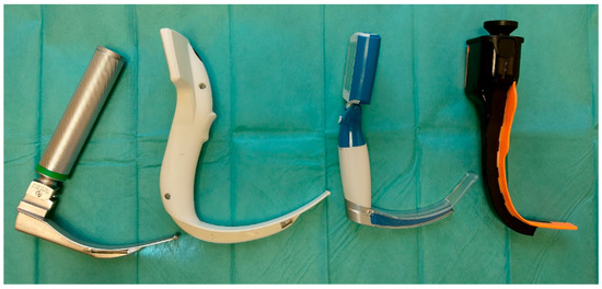 From the left: Macintosh laryngoscope, I-View laryngoscope, UESCOPE VL 400 laryngoscope, Non-Channeled Airtraq laryngoscope.