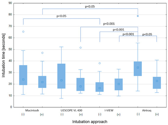 Failed tracheal intubation is one of the important causes of morbidity and mortality in susceptible patients [16,17]. Nearly 30% of anesthesia-related deaths are due to the complications of difficult intubation, and more than 85% of all patient-oxygenation complications result in brain damage or death [24]. The antidote to difficult airway problems was supposed to be the Airtraq. In our study, it proved to be the least useful for those without clinical experience. According to Saracoglu, the undeniable advantage of the Airtraq laryngoscope is that it can be used in patients with limited cervical spine mobility and a small degree of oral dilation (provided it is greater than 3 cm). The advantage of the use of this device decreases when we have to deal with secretions and soft tissue swelling. This is not a laryngoscope whose use is intuitive. Proficient use of it requires time and experience [25]. Giquello also came to similar conclusions. In his study, the average intubation time using the Airtraq laryngoscope was about 47 s, and the intubation success rate oscillated at 80% [25]. A slightly higher intubation success rate of 85% was reported by Kleine-Brueggeney [26]. Similar results were obtained in our study, where, as in Giquello’s study, the study group consisted of subjects with no experience in using the Airtraq laryngoscope. A separate conclusion was reached by Lu, who, based on a review of the available literature, concluded that, for those with little or no experience, the use of the Airtraq laryngoscope facilitates faster and more-accurate intubation, reducing the risk of the placement of the endotracheal tube in the esophagus [27]. According to Nowicki, the Airtraq laryngoscope provides as fast or even a faster intubation as the Macintosh laryngoscope, reduces the number of necessary maneuvers to optimize the view of the airway entrance, and lowers the risk of tooth damage. According to him, the learning curve is short, and this is true under normal, as well as difficult airway conditions [28]. Timmel, on the other hand, believes that the Airtraq laryngoscope cannot be recommended as a primary airway device in the prehospital setting without the extensive prior clinical experience gained in the operating room. This is because he believes that the process of learning the clinical use of the Airtraq laryngoscope is much longer than described in the anesthesiology literature [29]. According to Wetsch, video laryngoscopes used by experienced anesthesiologists did not facilitate endotracheal intubation in a model with an immobilized cervical spine any faster or safer than conventional laryngoscopy. It was the Macintosh laryngoscope that provided faster intubation than the Airtraq, although the intubation was faster with the latter than with other video laryngoscopes. In our study, where the study group was people with no clinical experience, the intubation time for the Airtraq was the longest [30].