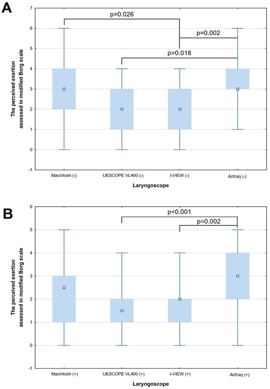 The comparison between the perceived exertion between the four laryngoscopes (Macintosh, UESCOPE, I-View, and Airtraq) used in both manners: (A) without (p < 0.001 in Kruskal–Wallis Test) and (B) with stylets (p < 0.001 in Kruskal–Wallis Test).