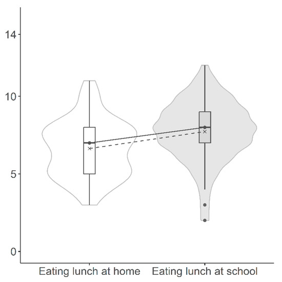 Adherence score to food consumption recommended by the Italian guidelines for healthy eating (CREA 2018) [15] differentiated by school meal consumption. Black continuous lines connect median values (black dot), while black dashed lines connect means (x).