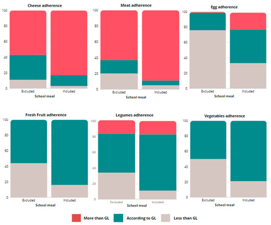 In this study, Swedish children were found to have below-standard consumption levels for both meat and dairy. Both Swedish and Estonian children exhibited higher intakes of cereals and potatoes compared to established guidelines. Optimal fish consumption was observed in Spanish children. Similar to our analyses, this study also assessed how the introduction of school meals influences adherence to the Mediterranean diet guidelines. In Swedish preschoolers (aged 2 to 5 years), the addition of school meals resulted in decreased adherence, while the opposite trend was observed in school-aged children (aged 6 to 9 years), leading to improved adherence. Improved adherence with the addition of school meals (both in preschool and school age) was also noted in Hungarian and Spanish children. In our population, having lunch at school demonstrated varying effects on GL adherence, improving it in certain categories (vegetables, fruit, fish, eggs, and legumes) while worsening it in others (meat and cheese).