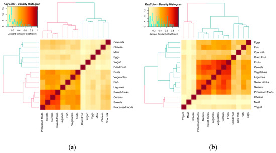 Dendrogram and heatmap describing adherence clustering for main food categories and representing food categories adherence co-occurrence. Co-occurrence was calculated using the Jaccard similarity index, where 0 (light yellow) represents when two food categories adherence never occur together and 1 (dark red) if they always appear together. Clustering was obtained using the complete linkage agglomerative hierarchical clustering method: (a) without accounting for school meals, (b) accounting for school meals.