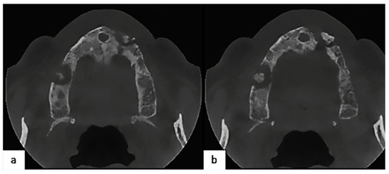 CT axial scans better show the osteolytic lesions on both sides of the maxilla. (a) Cranial slice; (b) caudal slice.