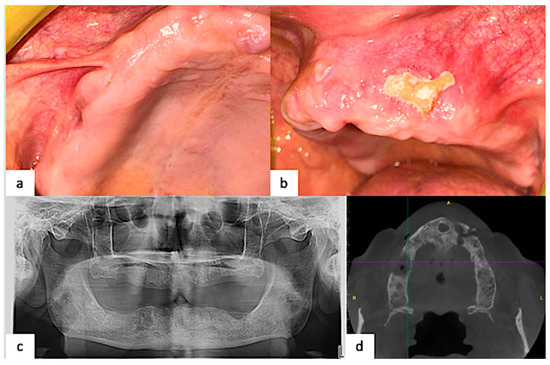 (a) Orthopantomography of the jaws before multiple teeth extractions; (b) at the time of our observation, bone exposure in the left maxilla; (c) first panoramic radiogram with evidence of an adjunctive osteolytic lesion at the site of 1.6; (d) right maxillary swelling with small draining bone exposure.