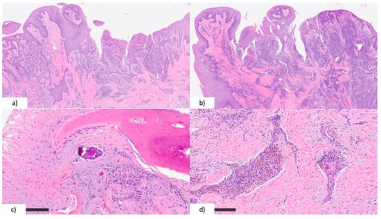 (a) Oral mucosa showing erosion and reactive pseudo-papillary hyperplasia of the epithelium (H&E, original magnification ×2); (b) conspicuous and extensive inflammation was present in the lamina propria (H&E, original magnification ×2); (c) closer detail revealing the histological appearance of bone necrosis (H&E, original magnification ×10); (d) fibrotic stoma with aggregates of lympho-plasma cell infiltrates and hemosiderin deposition (H&E, original magnification ×10).