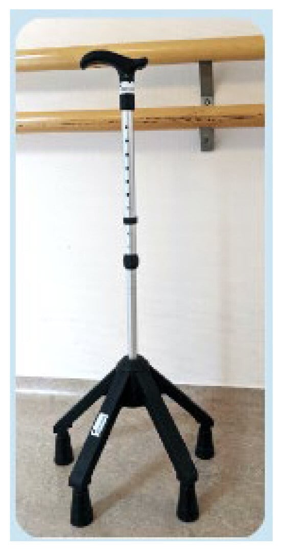 Figure 1 shows the quadripod cane that was used. It includes four fixed and stable feet. Thanks to its stability, the quadripod cane is the only model of canes that allows full-body weight bearing. It is often used during neurological rehabilitation. It involves a 3-times gait because it requires a break during gait while the patient takes the cane off the floor.