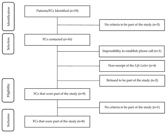 Nineteen dyads (cancer patients and FCs) that were integrated our previous studies were initially identified. Three dyads did not fulfill the 3rd inclusion criterion and were therefore excluded from the study. The 16 FCs were contacted by phone, through which they were informed about the objectives of the study and invited to participate. Only 9 FCs fulfilled all the inclusion criteria and accepted the opportunity to take part in the study. However, one of the participants was excluded during the interview stage after revealing that they did not remember the LL and presenting an incoherent and divergent speech, making data collection unfeasible (inclusion criteria 4). The final sample consisted of 8 participants (Figure 1).