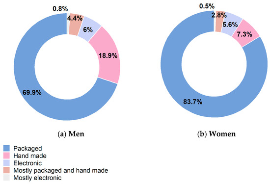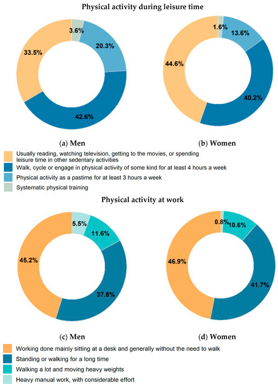 During leisure time, the most prevalent activities were walking, cycling or engaging in physical activity of some kind for at least 4 h a week (43% of men and 40% of women), closely followed by sedentariness activities (34% and 45%), physical activity as a pastime for at least 3 h a week (20% and 14%) and systematic workout (4% and 2%) (Table 2, Tables S2 and S15, Figure 2 and Figures S3–S6).