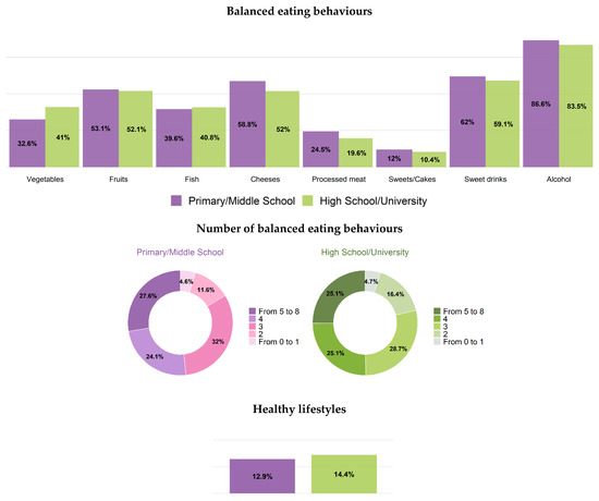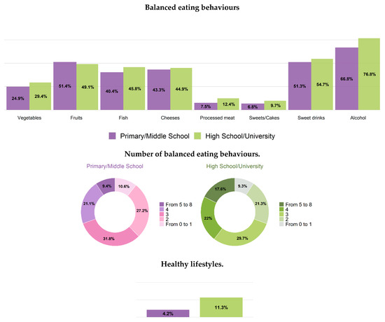 Prevalence of balanced eating behaviours in men and women was, respectively: 28% and 39% for vegetables (a mean of 168 g per day in men and 184 g/day in women), 50% and 52% for fruits (a mean of 268 g/day in men and 276 g/day in women), cheese 45% and 54% (a mean of 43 g/day and 37 g/day, respectively), 11% and 21% for processed meats (36.4 g/day and 24.4 g/day), 44% and 40% for fish (46 g/day and 43 g/day), 9% and 11% for sweets/cakes (84 g/day and 78 g/day), 54% and 60%, for sweet drinks (100 mL/day and 73 mL/day) and 74% and 84% for alcohol consumption (15 mL/day and 6 mL/day) (Table 3, Table 4, Table 5, Table 6, Table 7 and Table 8 and Tables S4–S9, Figure 3).