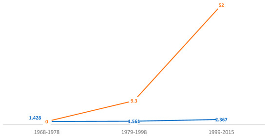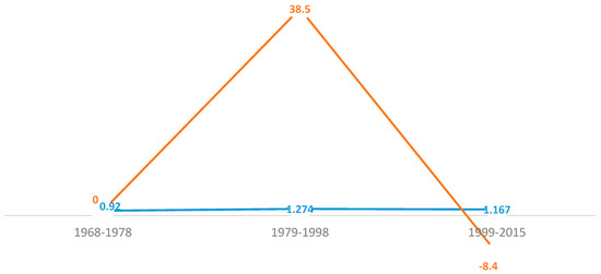 The percent change is shown by 1.274–0.920 = 0.354/0.920 = 0.385 × 100 = 38.5%, implying positive change from 1968–1978 to 1979–1998. This estimation demonstrates the percent change, 1.167–1.274 = −0.107/1.274 = −0.084 × 100 = −8.4%, implying there was a negative percentage change from 1979–1998 to 1999–2015 (Figure 2).