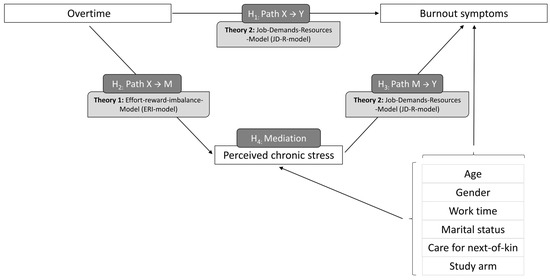 The data for this prospective study was derived from the IMPROVEjob trial and analyzed the role of perceived chronic stress as a possible mediator between overtime and burnout symptoms among German general practice personnel in the context of the COVID-19 pandemic. Based on the existing theory and previous research (see Figure 1 for our research model), we hypothesize that there is a correlation between overtime and burnout symptoms (H1), overtime and perceived chronic stress (H2), and perceived chronic stress and burnout symptoms (H3). In addition, we hypothesize that perceived chronic stress might have a mediating role in the development of burnout symptoms due to overtime (H4). Accordingly, we formulated the research question: ‘What role does perceived chronic stress play in the causal chain between overtime and burnout symptoms?’