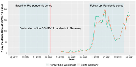 Seven-Day Incidence Rate of COVID-19 Cases during data collection period in Germany and the study region North Rhine-Westphalia. Note: Data for illustration was derived from Robert Koch Institute 7-day incidences according to federal states (21 April 2023) [44].