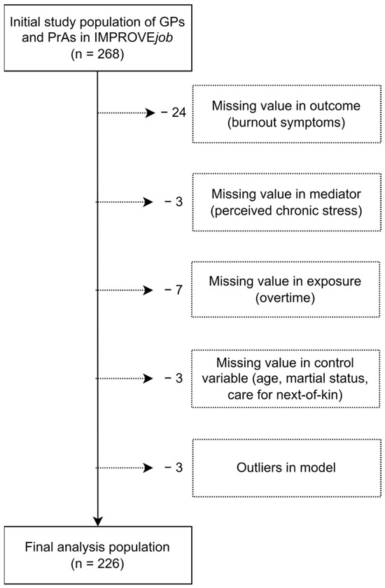 For this study, 42 cases from the original study population of IMPROVEjob (n = 268) had to be excluded due to missing values in the outcome variables or due to outliers in the model (Cook’s D > 3) leading to a final analysis population of 226 participants, of whom 68 were GPs and 158 were PrAs (Figure 3).