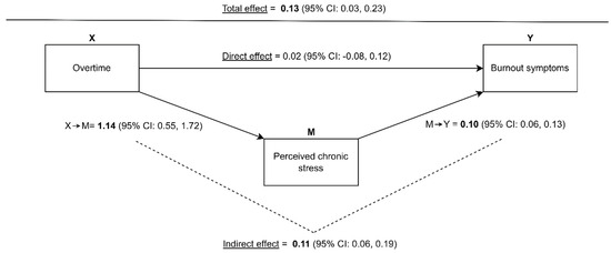 This approach includes each of the three paths of interest simultaneously in one model, namely the path between overtime and burnout symptoms (X → Y), the path between overtime and perceived chronic stress (X → M), and the path between perceived chronic stress and burnout symptoms (M → Y) (Figure 1).