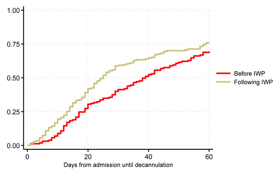 Effect evaluation of time until decannulation from a cuffed tracheostomy tube during inpatient rehabilitation before and after implementation of the action-oriented interdisciplinary weaning protocol (IWP). Right censored at discharge or 60 days of hospitalization, whichever came first.