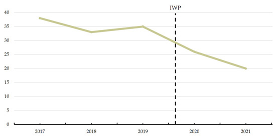 Decannulation rate during inpatient rehabilitation was 91% and 90% in patients before and after implementation of the IWP, respectively. Number of days from admission until decannulation from a cuffed tracheostomy tube decreased after implementation of the IWP, as illustrated in Figure 2 and analyzed in Table 3. In this analysis, subjects were right censored at discharge or at 60 days of hospitalization, whichever came first. There was a tendency toward a shorter length of hospitalization for inpatient rehabilitation, with median 102 (IQR: 73–138) and 90 (IQR: 58–119) days, before and after implementation of the IWP, respectively (p = 0.061). Additionally, there was a time trend showing that patients are being decannulated faster and faster in the years after implementation (Figure 3). A tracheostomy tube was reinserted in one patient before and after implementation, respectively. Risk of pneumonia was unchanged following implementation of the IWP with HR 0.899 (95%CI: 0.583; 1.385), in a Cox model adjusted for sex (Table S1 in the Supplementary Materials).