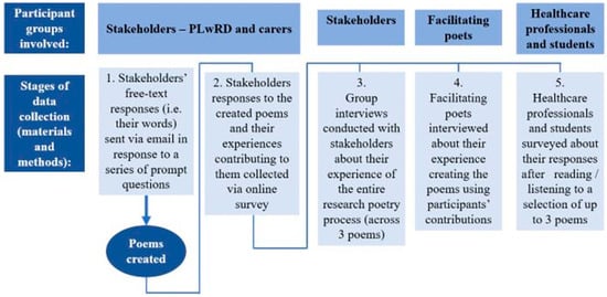 - Camic, P.M.; Harding, E.; Sullivan, M.P.; Grillo, A.; McKee-Jackson, R.; Wilson, L.; Zimmermann, N.; Brotherhood, E.V.; Crutch, S.J. Developing Poetry as a Research Methodology with Rarer Forms of Dementia: Four Research Protocols. Int. J. Qual. Methods 2022, 21, 16094069221081377. [Google Scholar] [CrossRef]