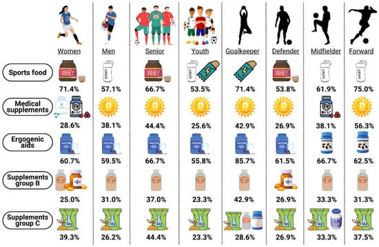 To our knowledge, this is the first study to analyze the differences in SS consumption among elite soccer players by different categories, playing positions, and genders. The main findings of this study were: (1) senior soccer players were more likely to consume SS; (2) although similar patterns were observed between sexes, differences emerged in the consumption of sports confectionery, whey protein, β-alanine, and melatonin; (3) only differences in caffeine consumption were highlighted among the different playing positions, with higher levels among midfielders and forwards.