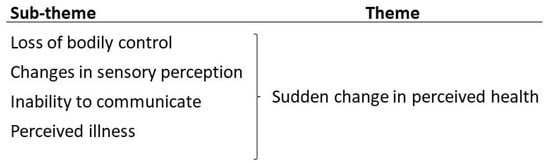 The sub-theme that surfaced in the description of changes in the patient’s sensory perception was the description of pain located somewhere in the body, headache, dizziness, numbness in a limb, hearing loss, or loss of sensations. There were also emotional changes in the patient described by the caller, such as ‘… she is so sad…’ or ‘she is crying’. The symptoms describing changes in the sensory perception were presented as a single sensation, e.g., ‘…she has a terrible headache…’, and as a combination of sensations, e.g., ‘I suddenly got a terrible sound in one ear, and then I became dizzy…’ and ‘…it hurts in the head and in the arms’.