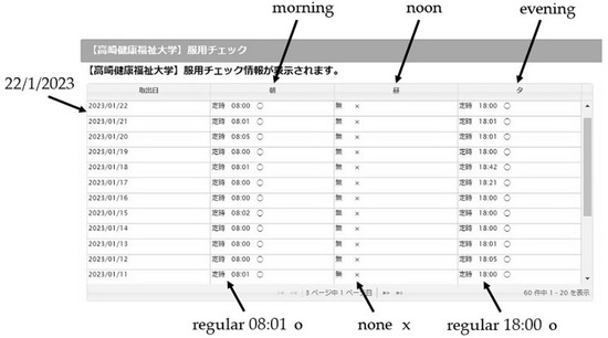 Data on medication (taken and not taken) were retrieved from Fookkun®, and the reception of data from the prototype data transmitter was confirmed by Hoppe®. Figure 3 shows a snapshot of the pharmacy viewing system screen for pharmacists. The vertical axis represents the date, while the horizontal axis represents the medication time (morning, noon, and evening). When a patient takes a medication, the time and symbol ‘o’ are displayed; if the patient forgets to take the medication, the time and the symbol ‘x’ are displayed. Also, if the patient is not prescribed a medication to be taken at noon, the symbol ‘x’ is displayed. The pharmacist can check the patient’s medication adherence by reviewing the pharmacy viewing system screen.