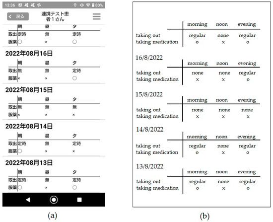 Data of E-MRB when the patient had fallen ill: (a) Smartphone screen (in Japanese); (b) Screen image modified in English (800 × 660 pixels).