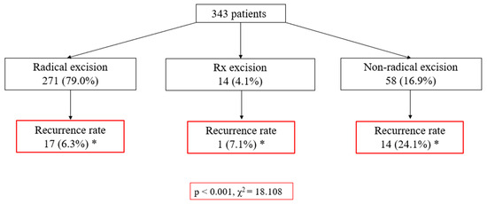 Patient distribution following surgical treatment of basal cell carcinoma based on radicality and recurrence rate. Note: * statistically significant value p < 0.05; Cells highlighted in red are considered statistically significant; Rx excision—excision of undetermined extent.