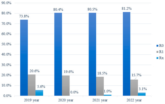 Patient distribution following surgical treatment of basal cell carcinoma based on surgical radicality from 2019 to 2022.