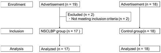 Flow chart for this study. We recruited 19 participants in the NSCLBP group and 18 in the control group; 2 were excluded because they did not match the inclusion criteria, 17 were assigned to the NSCLBP group, and 18 to the control group for analysis of trunk muscle activity.