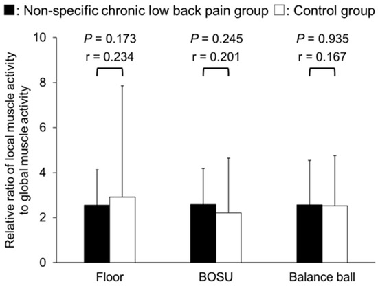 In the present study, the ratio of lumbar multifidus activity to erector spinae was significantly lower in the NSCLBP group than in the control group in the balance ball condition. This result supports our finding that spinal erector spinae muscle activity in the balance ball condition, normalized by muscle activity on the floor, is greater in NSCLBP patients than in controls. After all, exercise using the balance ball in patients with NSCLBP can emphasize inappropriate muscle recruitment patterns, and clinicians should be aware of changes in trunk muscle activity. Our study also showed that the ratio of internal oblique/transversus abdominis muscle activity to rectus abdominis muscle activity was significantly lower in the NSCLBP group than in the control group under all conditions. This result indicates that abdominal muscle imbalance occurs in individuals with NSCLBP, regardless of whether the condition is unstable or not. A previous study reported that patients with LBP cannot preferentially work the transversus abdominis muscle over the rectus abdominis muscle [41]. A previous study reported an improvement in the ratio of internal abdominal oblique muscle activity to rectus abdominis muscle activity in patients with LBP after 10 weeks of exercise therapy, focusing on local muscle activity [18]. The results of local to global muscle activity ratio suggest that exercises to increase local muscle activity must first be performed. On the other hand, there was no significant difference in the ratio of internal oblique/transversus abdominis muscle activity to external oblique muscle activity between the groups in all conditions. A previous study has shown that the demand for external oblique is greater in exercises that occur when a rotational moment of the spine is expected, such as a single bridge with one leg elevated [19]. The present study examined muscle activity during symmetrical exercises, which may not have provided sufficient muscle activity for intergroup differences to exist.