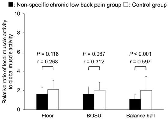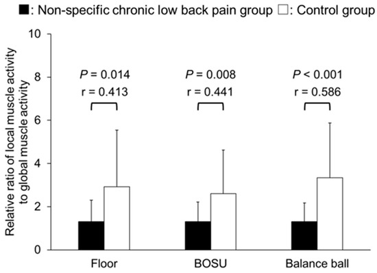 The trunk muscle activity normalized by floor bridge exercise under the balance ball condition in non-specific chronic low back pain and control groups. Significant differences between the balance ball and floor conditions are indicated by asterisks (*** p < 0.001; ** p < 0.01; * p < 0.05).