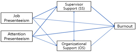 Furthermore, studies suggest that support or encouragement from organizations or supervisors reduces burnout symptoms that negatively affect oneself, patients, and organizations [32,33,34]. According to the JD-R model, job resources may buffer the impact of job demands on job strain, including burnout [35]. A high-quality relationship with one’s supervisor and organization may alleviate the influence of job demands (work overload, emotional and physical demands) [36]. Based on the aforementioned arguments, we selected organizational support and supervisory support as variables expected to alleviate the negative impact of presenteeism on burnout among RMWs and examined their multiple mediating effects. Supervisory support refers to employees’ perception of their superior’s attention and support toward them during their work performance [37]. In previous studies, supervisory support was found to be a significant variable that reduces burnout [38,39,40]. Organizational support refers to employees’ perceptions of the extent to which the organization values their contributions and cares about their well-being [41,42]. Many researchers, like Cropanzano et al. [43], who studied the relationship between organizational support and burnout, argued that the higher the perceived organizational support of organizational members, the lower their job-related burnout [44].