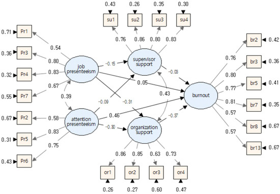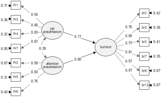 Regression analysis was conducted using a structural equation model to verify the effect of presenteeism among RMWs on burnout. The results are presented in Table 4 and Figure 2.