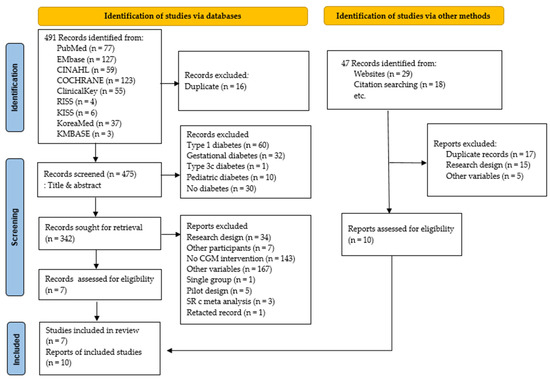 The literature search was conducted based on COSI (COre Standard, Ideal) provided by the National Library of Medicine (NLM) using the following core databases [17]: international databases such as PubMed, CINAHL, Cochrane Library, EMBASE, and ClinicalKey and domestic databases such as Research Information Sharing Service [RISS], KMbase, KISS, and KoreaMed. The search was conducted for studies published up to 31 May 2023. The primary search terms used were ‘diabetes mellitus, type 2’ [MeSH Terms], ‘continuous glucose monitoring’, and ‘glycemic control’ [MeSH Terms]. For domestic databases, the search was conducted using combinations of type 2 diabetes, continuous glucose monitoring, and glycemic control. In addition, manual searches were conducted for studies included as references, and the Google Scholar search engine was utilized for related research topics. This review protocol was registered with Prospero registration no. CRD42024505351 available at https://www.crd.york.ac.uk/prospero/#recordDetails (accessed on 3 February 2024).