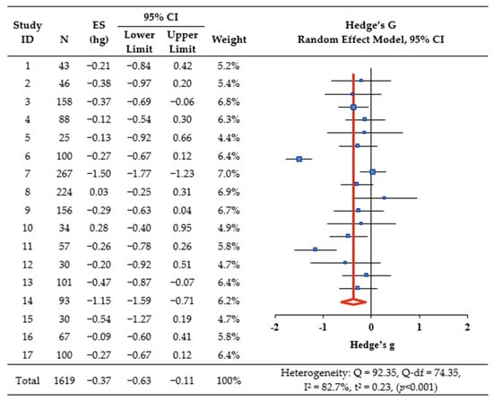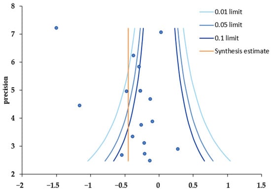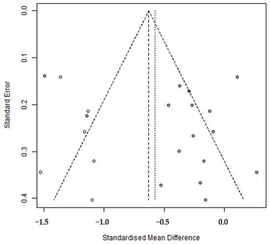 Data analysis was performed using MIX 2.0 Pro, version 2.015 (MIX Professional software for meta-analysis in Excel) [19]. For all study outcomes, Hedge’s g was utilized as the effect size, considering that many studies had a small sample size [20]. Hedge’s g values were interpreted as follows: an effect size of ≥0.2 but <0.5 was categorized as small, an effect size of ≥0.5 but <0.8 as medium, and an effect size of ≥0.8 as large [21]. The significance level for effect size was set at 0.05, and the confidence interval (CI) at 95%. The analysis was conducted using a random effects model because of the variances exhibited by study participants and study heterogeneity. Heterogeneity was assessed using the I-squared (I2) statistic and was deemed absent when I2 was 0%, medium at 50%, and high at 75% [22]. Egger’s regression and Begg’s tests and the trim and fill method were used to confirm publication bias [23,24].