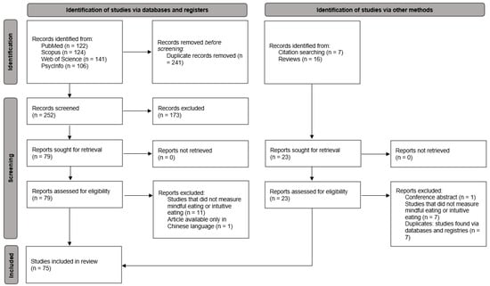 Searches for peer-reviewed journal articles were performed in Scopus, Web of Science, PsycInfo, and MEDLINE/PubMed. There were no restrictions on language or year of publication. The databases were searched using key phrases and Boolean operators that were established based on the PICO (Problem, Intervention, Comparison, and Outcome) criteria (Table 1). Web of Science, Scopus, PsycInfo, and Pubmed were searched up to 3 November 2023. The literature search was performed using the following terms without restrictions (“intuitive eating” OR “mindful eating” OR (mindfulness AND (eating OR food OR diet*))) AND (“higher education students” OR “university students” OR “college students”). The reference lists of selected studies were hand-searched, and additional references were included if relevant and if not retrieved by the initial database searches.