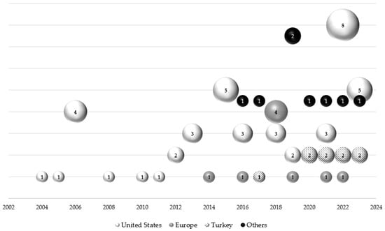 Most of the studies were carried out in the United States (n = 46, 61.3%), followed by Europe (n = 12, 16%), Turkey (n = 9, 12%), and other countries (n = 8, 10.7%) (Figure 2).