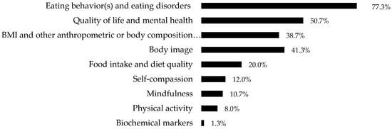 The outcomes were grouped by category, and the frequencies with which they were evaluated in the studies were as follows: eating behavior(s) and eating disorders (n = 58, 77.3%); quality of life and mental health (n = 38, 50.7%); BMI and other anthropometric or body composition assessments (n = 29, 38.7%); body image (n = 31, 41.3%); food intake and diet quality (n = 15, 20%); self-compassion (n = 9, 12.0%); mindfulness (n = 8, 10.6%); physical activity (n = 6, 8.0%); and biochemical markers (n = 1, 1.3%) (Figure 3).