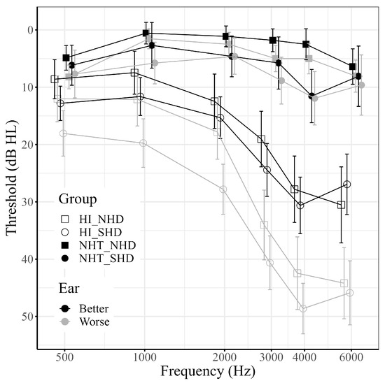Mean hearing thresholds for better and worse ears across groups. Error bars represent 95% confidence intervals. Shape represents hearing difficulty group (squares: non-significant hearing difficulties, NHD; circles: significant hearing difficulties, SHD). Fill represents hearing status group (filled: normal hearing thresholds, NHT; open: hearing impaired thresholds, HI). Color represents ear (black: better ear; grey: worse ear). Note that within both the NHT and HI groups, SHD and NHD listeners have similar thresholds.