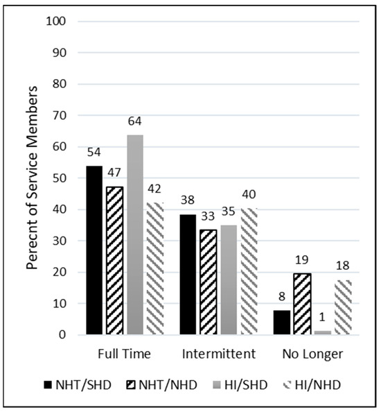 Service members were asked how often they wear their current hearing aids with response options described previously. Figure 2 displays the distribution of self-reported responses for each group. All groups reported their highest proportion of use was full time. That is, most SMs used their hearing aids full time, regardless of peripheral hearing status. It is emphasized here that “full time” was not defined by a specific number of daily hours of use, but rather self-identified by the participant. However, the groups with non-significant self-reported hearing difficulties (NHT/NHD and HI/NHD) had substantially higher percentages of no longer wearing their devices compared to the groups with significant self-reported hearing difficulties (NHT/SHD and HI/SHD), regardless of hearing status.