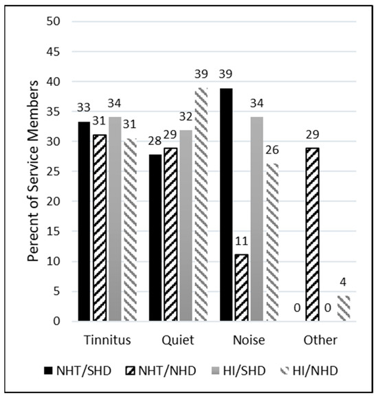 As seen in the right column of Table 2, the predominant reasons selected for the prescription of hearing aids across all groups were difficulty hearing quiet sounds (n = 115) and tinnitus (n = 113). In the NHT groups, encompassing both SHD and NHD, tinnitus emerged as the primary reason hearing aids were prescribed (n = 20). Conversely, within the HI groups, the principal reason was difficulty hearing quiet sounds (n = 97). In the SHD groups, which included both NHT and HI individuals, difficulty understanding speech in noisy environments and tinnitus were the leading reasons (n = 71 and 70, respectively). In the NHD groups, the primary reason was difficulty hearing quiet sounds (n = 50). Figure 3 depicts the percentages of these observations across groups. Of note, among the NHT group with NHD, difficulty understanding speech in noisy environments was reported as a reason only 11% of the time. In contrast, the NHT group with SHD reported this difficulty more than three times as often (39% of the time).