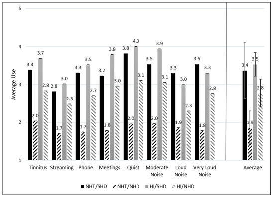 For the tinnitus-only groups, average usage was compared between those who reported tinnitus as their only reason for being prescribed hearing aids (+T) and those who did not report tinnitus as their primary reason (−T) (i.e., tinnitus was indicated with another reason); see Figure 5a,b. This was further divided into those with NHT or HI and those with SHD or NHD. Figure 5a depicts those with SHD with consistently high usage for all situations except for streaming music to the hearing aids in the NHT/SHD−T and HI/SHD+T groups and speech in loud noise in the HI/SHD+T group. Conversely, in Figure 5b, which depicts those with NHD, usage is reported low across most listening situations.
