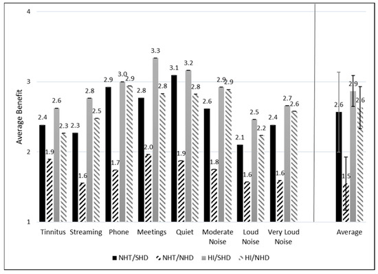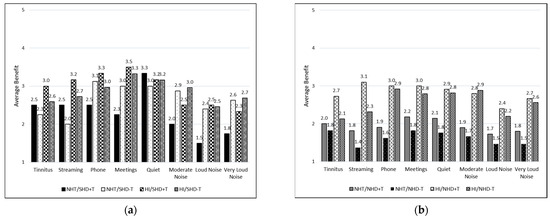 Figure 6 and Figure 7 depict the average ratings of hearing aid benefit across groups for each listening situation. Each response was assigned a numeric value from 1 to 4 for the purpose of statistical analysis, with higher scores indicating more benefit. Higher benefit scores are reported for the NHT/SHD group compared to the NHT/NHD group when averaged across all listening situations. This difference is not observed when comparing the HI/SHD and HI/NHD groups. Figure 7 depicts the average benefit for those who may or may not have reported tinnitus as their primary reason for obtaining hearing aids. Specifically, Figure 7a represents those with SHD and Figure 7b represents those with NHD. Average benefit was overall higher for most listening situations for the SHD group compared to the NHD group, regardless of tinnitus being the primary reason for prescription.
