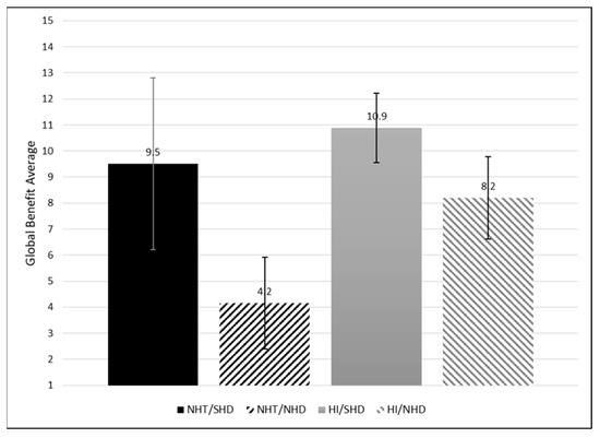 To obtain a more comprehensive understanding of the benefits of hearing aids among these groups, a global score was calculated for benefit by adding benefit rating and use across all situations; see Figure 8. Weighting the global benefit by the reported use provides a total benefit score. A significant global benefit difference is observed between the NHT/SHD and NHT/NHD groups but not the HI/SHD and HI/NHD groups. This suggests that those with SHD have comparable global benefit, regardless of HI Status.